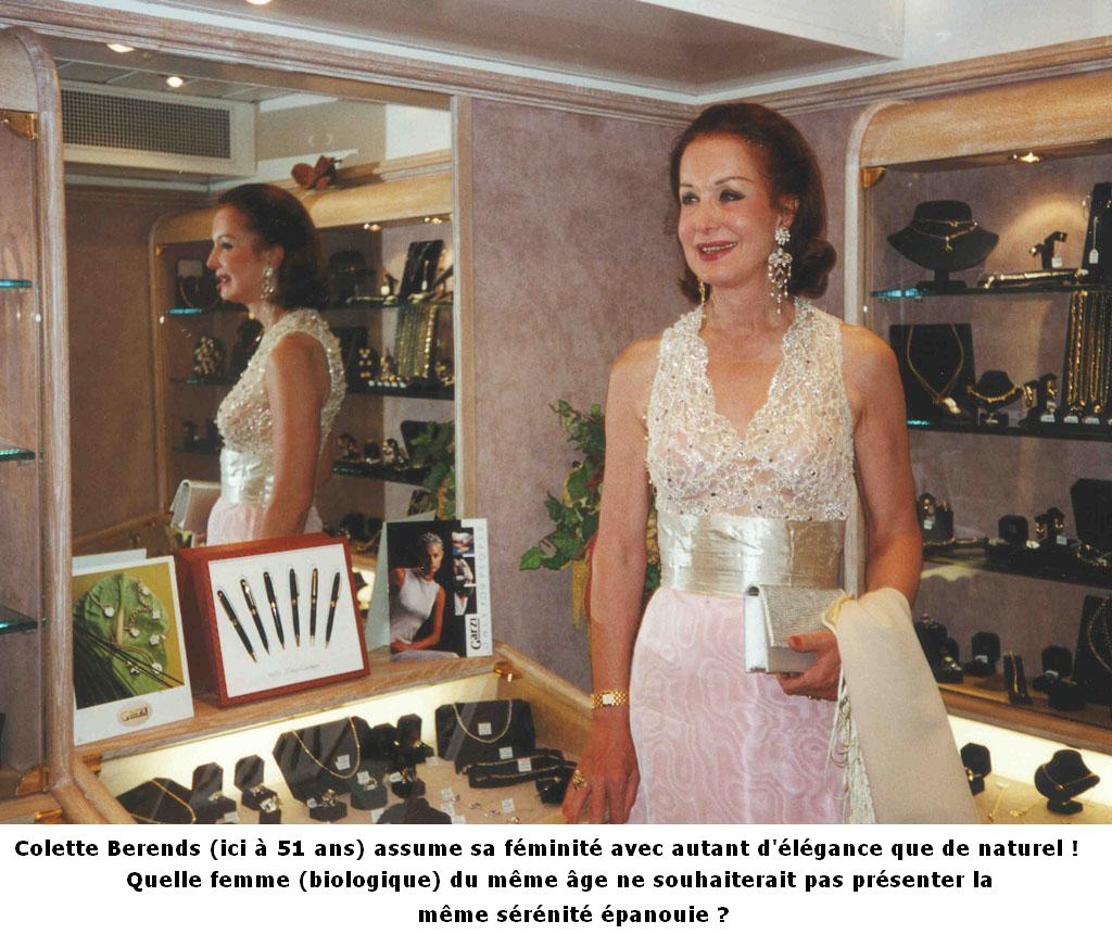 En 1971 Colette obtient de la chirurgie une réattribution de sexe. Enfin femme ! Elle ne veut pas faire mentionner son nom dans le journal. Elle soumet une exigence : "Je veux vraiment parler de mon passé mais je ne veux pas être insulté dans la rue à ce sujet. C'est pourquoi j'insiste sur le fait que vous faites un bon article de journal concernant ceci qui prouve que je suis quelqu'un qui a trouvé sa place dans sa vie. C’est comme ceci et je veux que les lecteurs comprennent que c'est ainsi. Beaucoup de gens voient le transsexualisme comme quelque chose d’étrange, mais le Genderstichting – c’est un groupe d'experts médicaux et psychologiques - déclarent que le transsexualisme est un sentiment authentique d’appartenir à l'autre genre et que ce n'est nullement un trouble mental. J'ai toujours été très féminin dans tous les aspects et je n'ai aucun désordre." Sans permettre aucune objection : "Convenez, j'étais une princesse, n'est-ce pas ?..." Les photos des élections de 'Miss' en sont sûrement la preuve. 'Colette de Hollande' paraissait et paraît toujours aussi merveilleuse... les propriétaires des cabarets ne sont pas des œuvres de charité. Pendant quinze ans, Colette exerce ses talents (et ses charmes) dans le show-business. Travaillant dans toute l’Europe et en Afrique du nord, elle prend des hormones (œstrogènes) et économisé de l'argent pour préparer ses opérations chirurgicales. Elle exerce d'abord en tant que travesti, portant une perruque blonde, puis plus tard, après son opération à Casablanca, en tant que 'vraie femme'. Après elle travaille dix mois par an et le reste de son temps elle prend l'habitude de voyager. Par exemple en Inde où elle dort dans les palais de Maharadja qui, peu de temps après l'indépendance, avaient été transformés en très beaux hôtels cinq étoiles ; à Hong Kong où elle dîne sur les restaurants flottants ; à Singapour où elle assiste à des spectacles de travestis ; à Bali où elle a été passionnée par les danses de temple ; dans les forêts tropicales de Bornéo où elle a dormi dans des ranches. Elle a également traversé l’Amérique du sud et les États-Unis et fait des croisières le long de l’Europe du nord, en Méditerranée et dans les îles grecques. Colette Berends a voulu voir le monde et a voulu avoir la confirmation pour elle-même, en tant que femme. "Et cette confirmation que j'ai obtenue", nous indique-t-elle. "Sur des navires de croisière, au cours des élections de "Miss" j’ai souvent été élu premier ou deuxième ; et pendant mon travail dans des boîtes de nuit j'étais une femme parmi les autres femmes. J'étais une dame attirante. N'est-il pas merveilleux, tout en dansant, d'avoir un homme qui vous chuchote à l’oreille que vous paraissez belle ?"