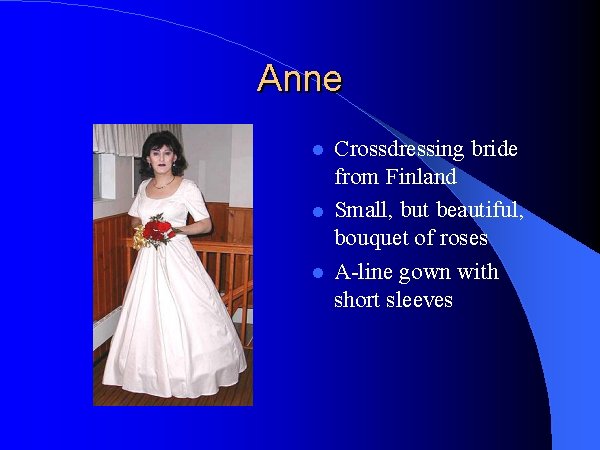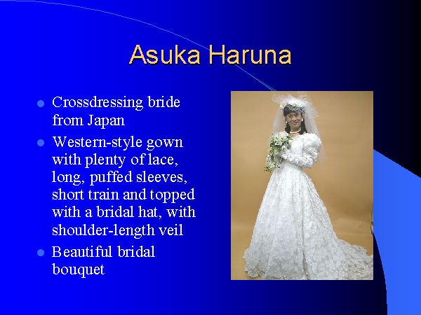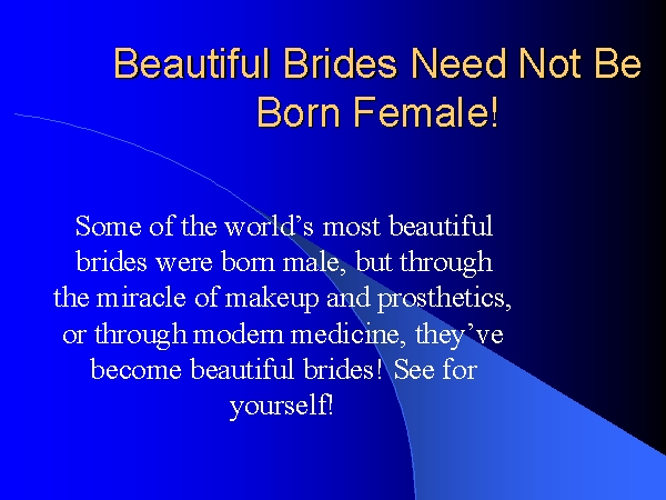 Le diaporama qui suit (49 planches, dans l’ordre normal de lecture) montre qu’il n’est pas indispensable d’être une fille pour être une jolie mariée. Quelques-unes des plus belles mariées du monde ne sont pas nées "fille". Mais grâce à quelques artifices prothétiques et un maquillage adroit, voire à l’aide de correctifs de la chirurgie moderne, ils sont devenus de superbes mariées !